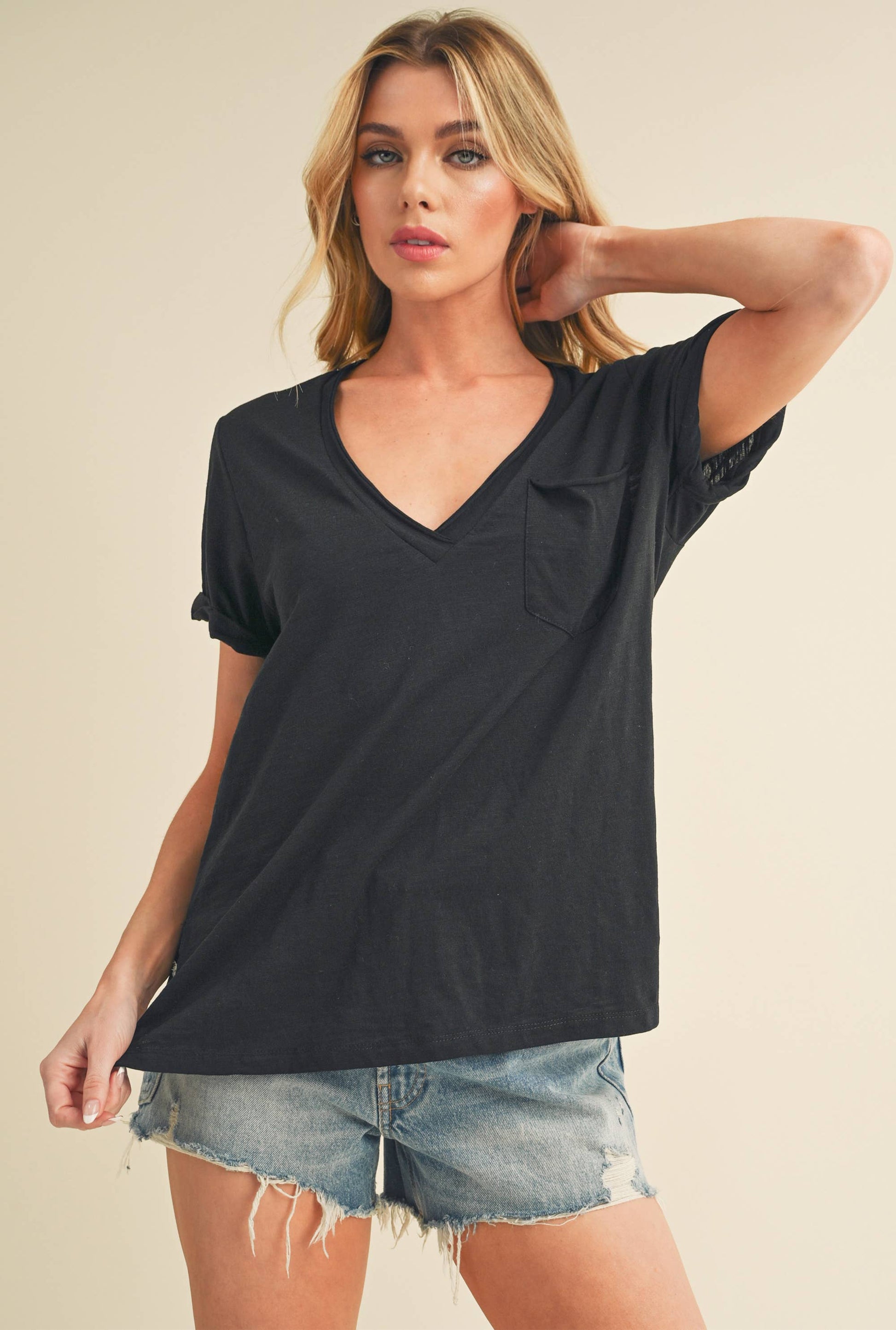 Upgrade your style with this rolled sleeve tee for a lived-in look and raw seam detailing at the v-neckline for an edgy touch.