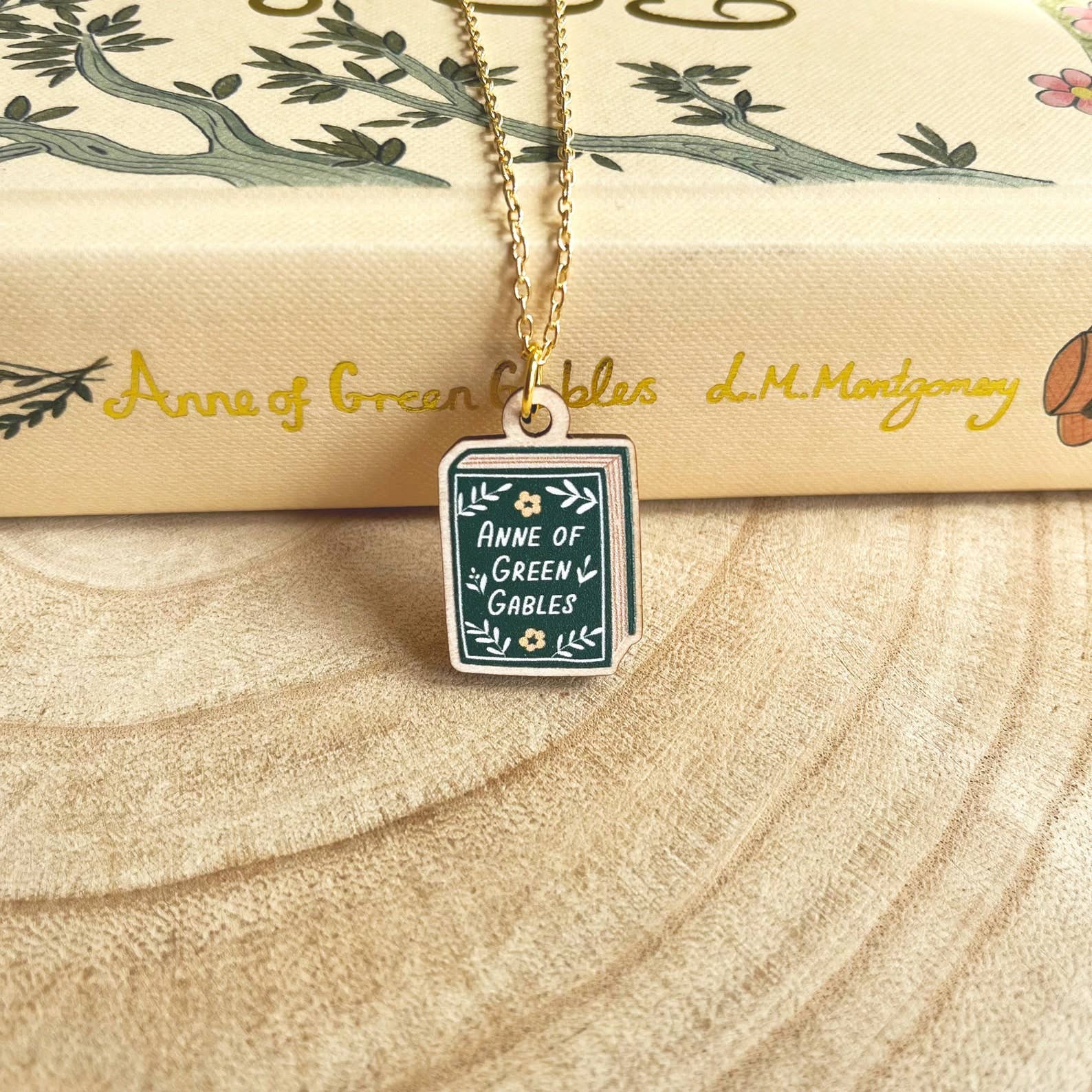 The mini dark green book-shaped necklace is digitally printed onto responsibly sourced wood. It comes with a library card inspired backer featuring character names from L. M. Montgomery's beloved book. The necklace is finished with an 18 inch gold plated chain.