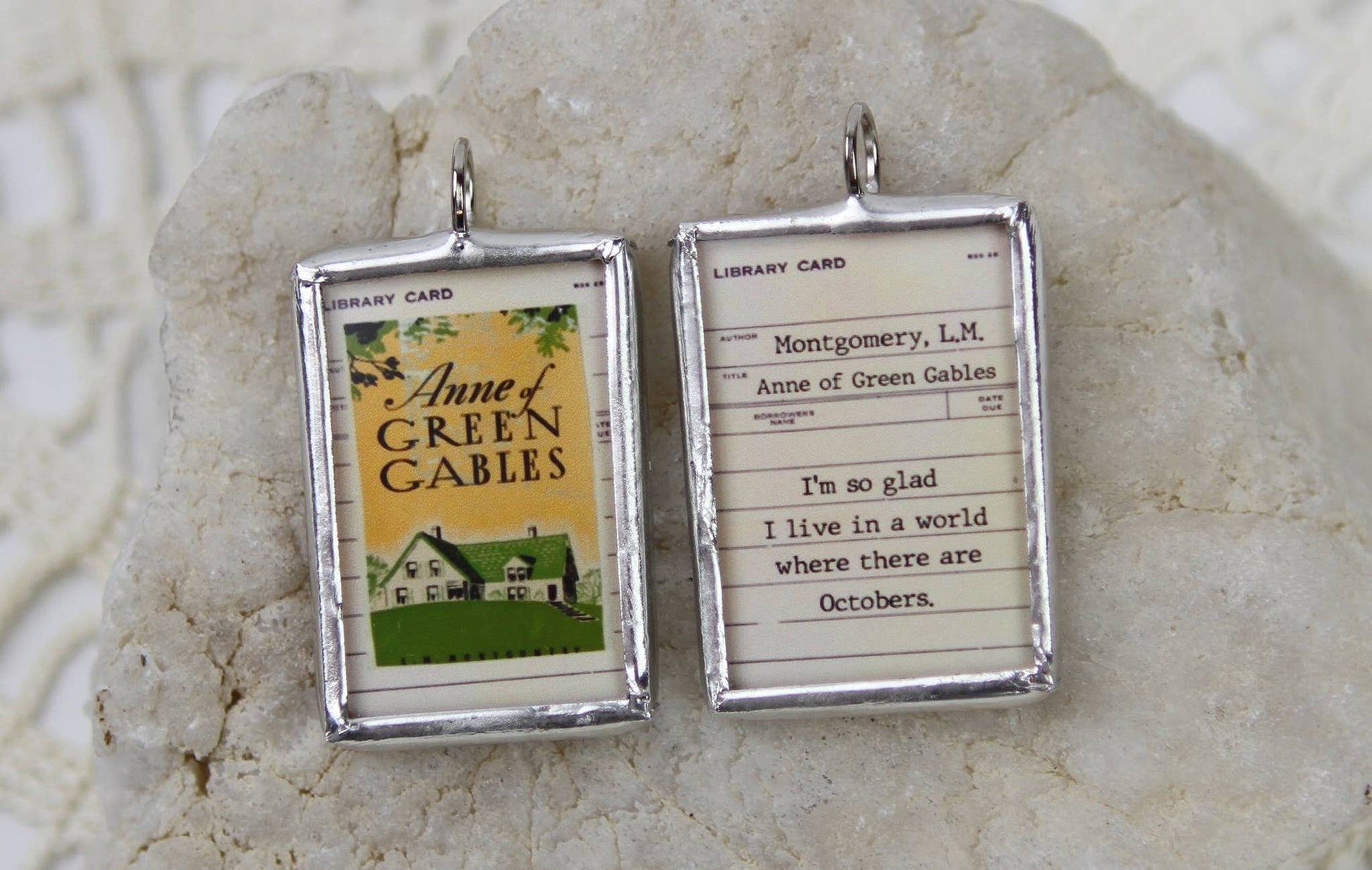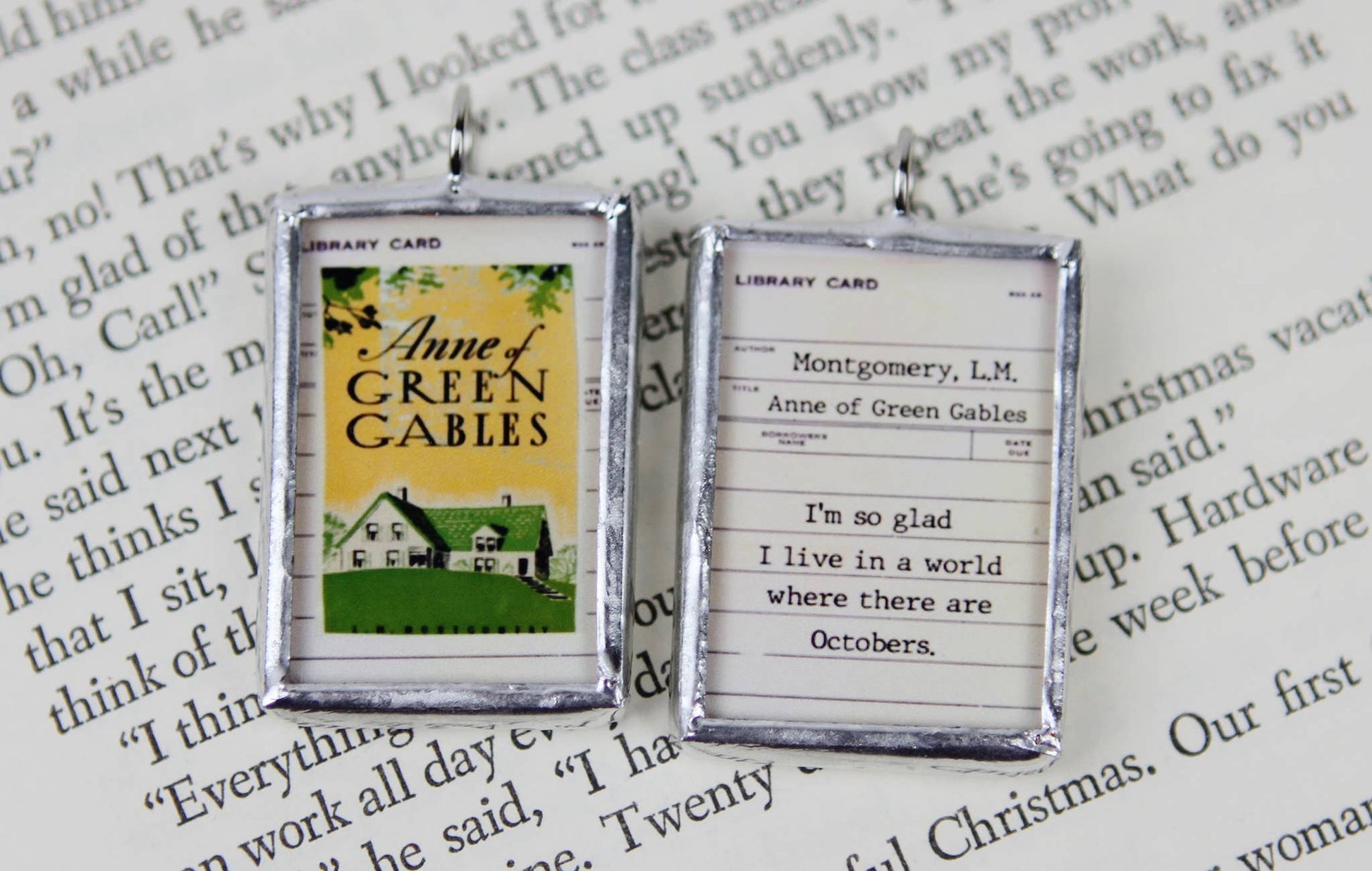 Created from the original book cover, our two-sided soldered charms are hand soldered in our Minnesota studio, so little variations are not only accepted, but expected and add to the charm of the piece. Materials: recycled glass, paper, lead free + jewelry grade solder. Dimensions: Soldered charm 1" x 1.5".
