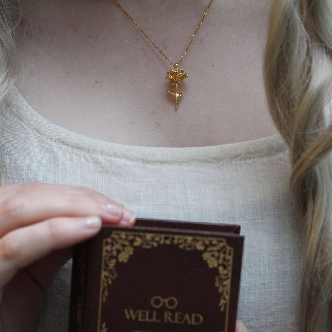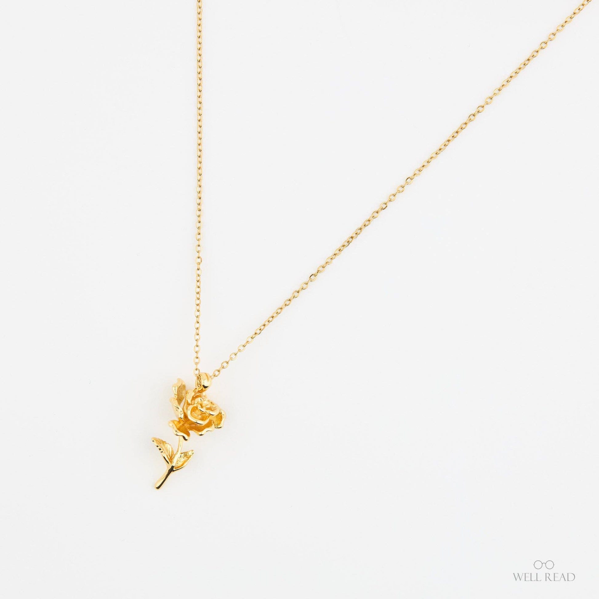 The pendant showcases intricate details, from the delicate petals to the slender stem and intricate leaves, all while maintaining a luxurious golden sheen. Suspended from a sleek, minimalist chain, this piece strikes a perfect balance between fairytale enchantment and modern elegance, making it the ideal companion to our "Beauty and the Beast" book crossbody bag.