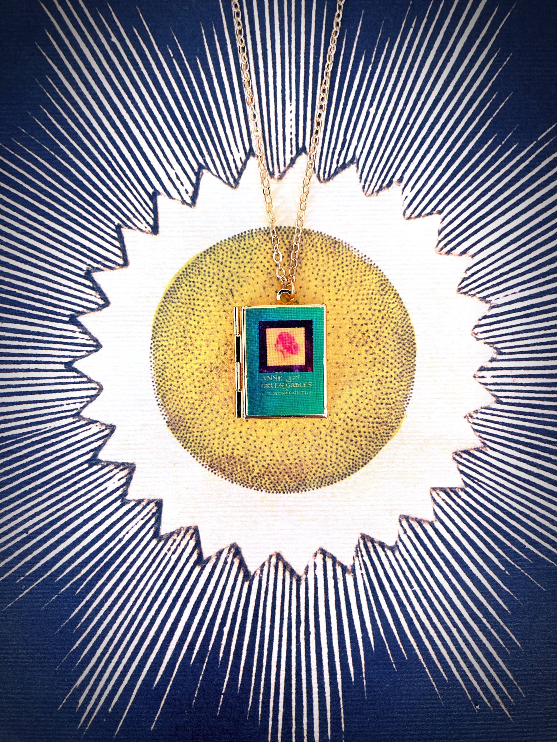 Our book lockets are made with nickel free materials and feature the most beloved classic and modern books! They are on 24-inch chains and are sealed with a gloss finish for durability. Each locket can hold two pictures and can be purchased in stainless steel, bronze or gold tone (as shown). If you would like in a different material shown, just send a message to let me know! These have been amazing sellers for us and loved by our customers! We think yours will love them too! If there is a story you're interested in us making, please feel free to contact us! Lockets are approximately 1 inch in height and 3/4 inch wide. All locket imagery is digitally altered from the original and is not officially licensed.