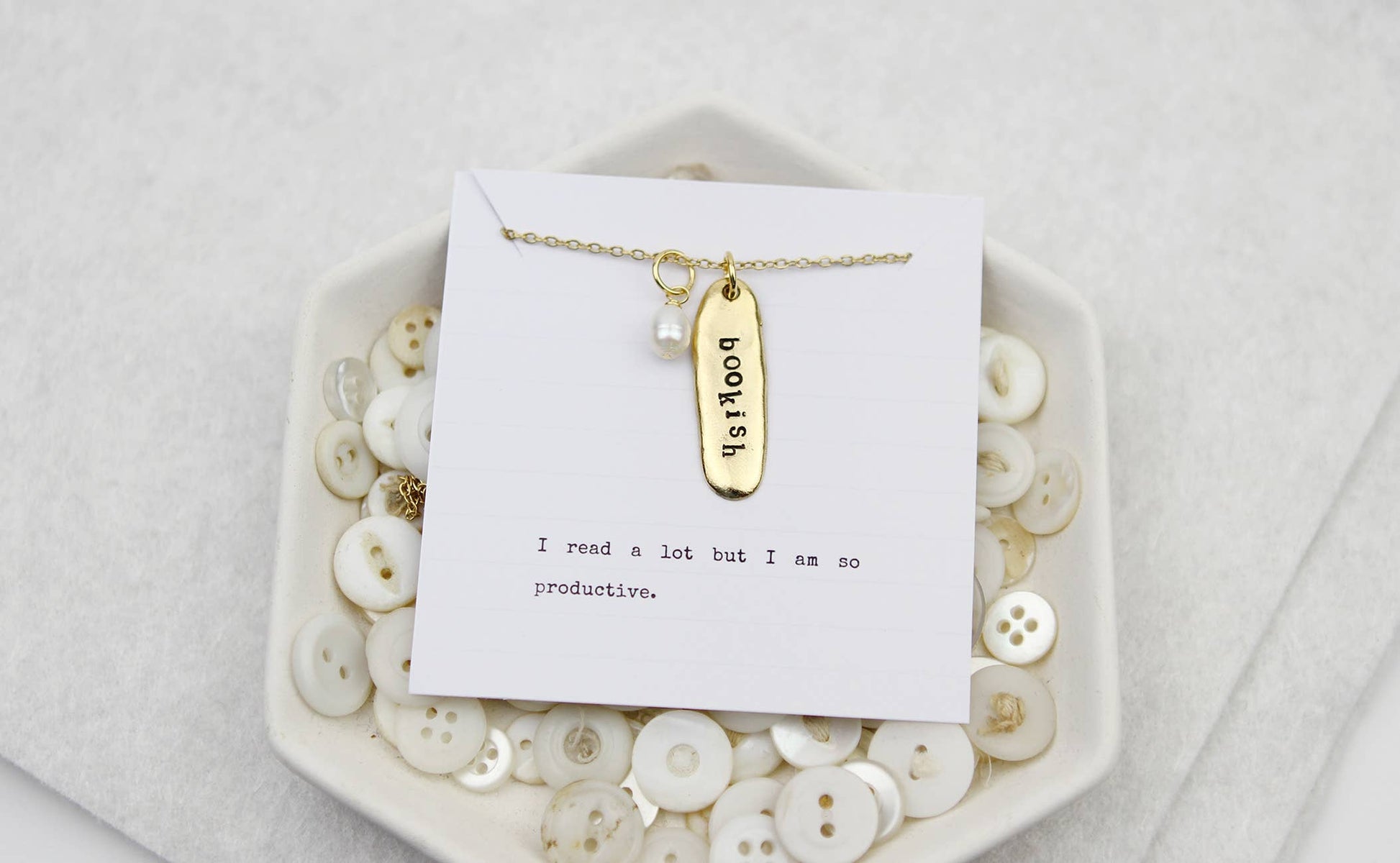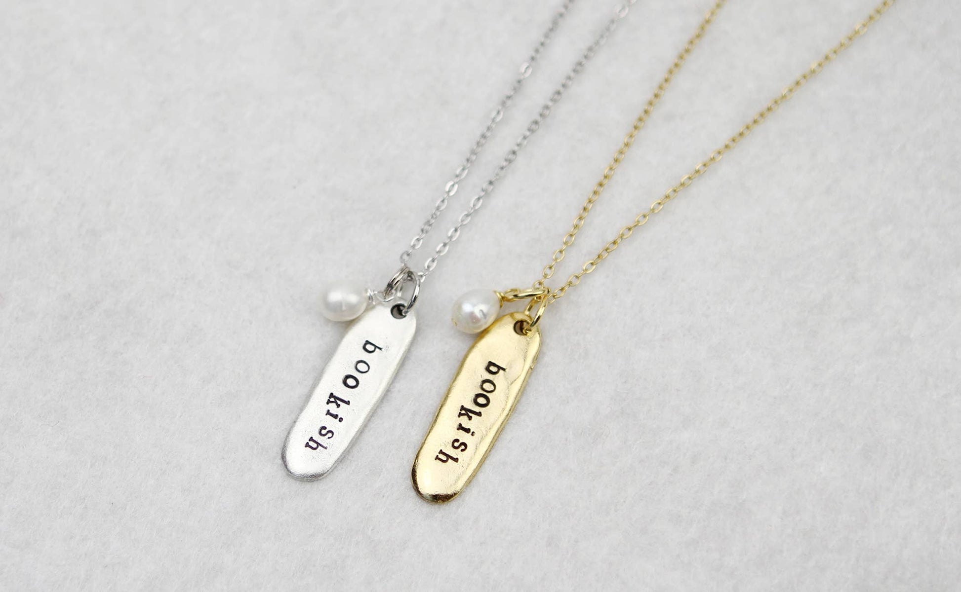 This simple, classic necklace comes packaged with an inspirational book quote, making it the perfect gift for bibliophiles. Choose from silver or gold. Handmade in the USA. Each charm is hand stamped letter by letter in Jennifer Dahl's Minnesota studio. Dimensions: 3/8" wide by 1 1/4" long oval charm, 18" stainless steel chain with a lobster clasp, freshwater pearl Materials: lead-free pewter plated 24k gold or .999 fine silver, plated in the USA with precious imported metals.