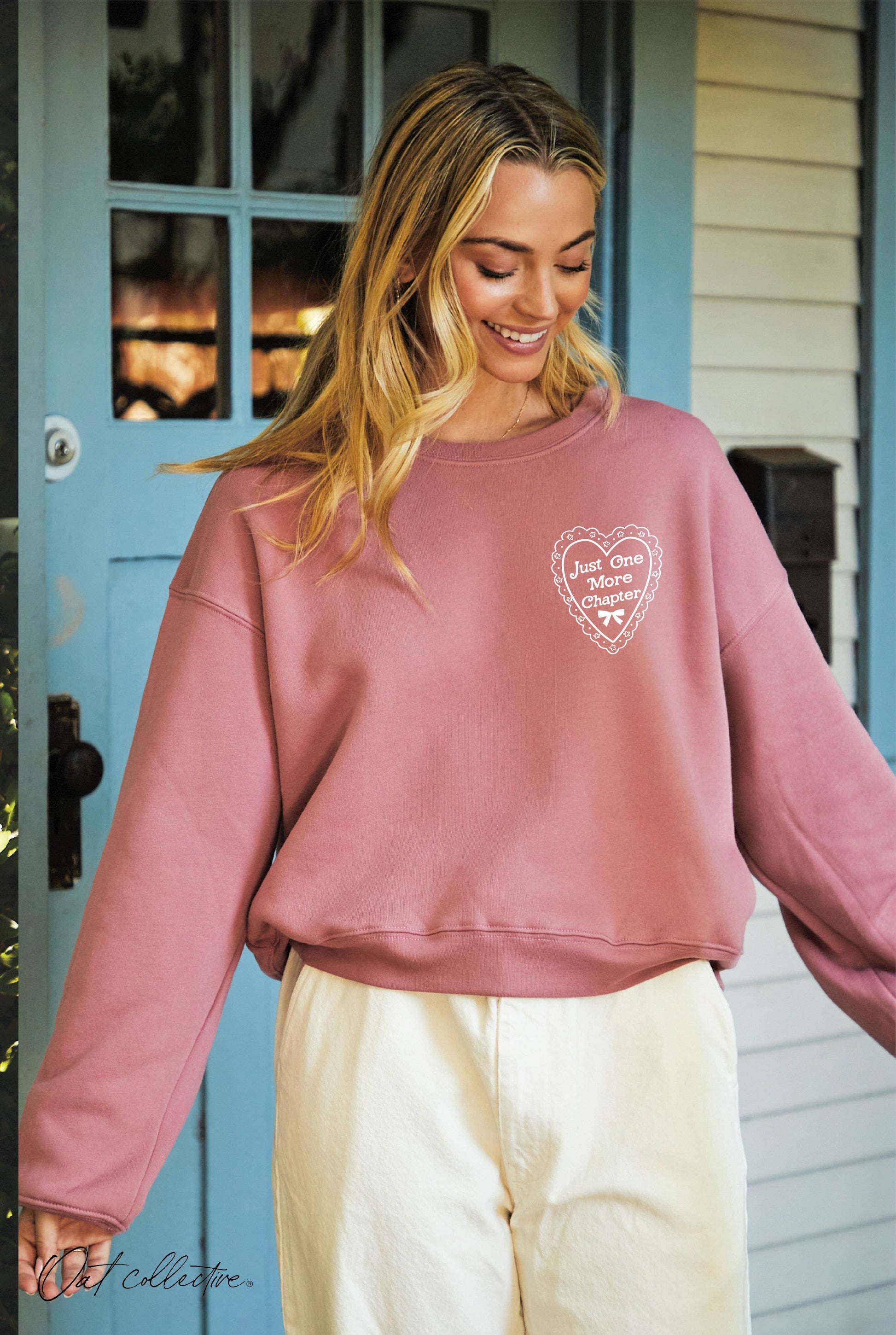 JUST ONE MORE CHAPTER Mid Cropped length Graphic Fleece Pullover Relaxed Fit.