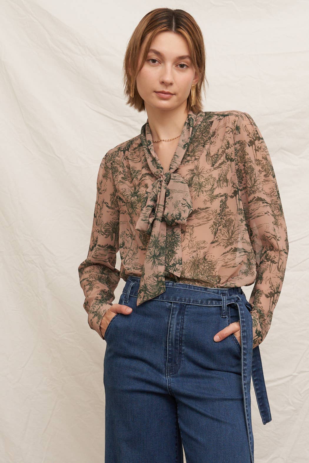 Printed Long Sleeve Tie-Neck Chiffon Blouse
