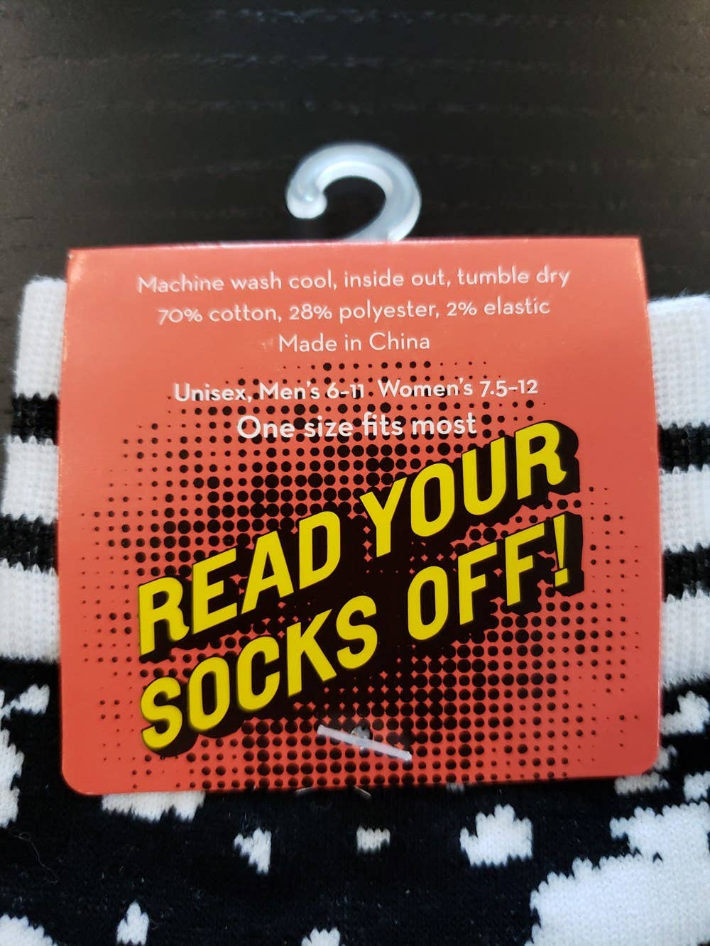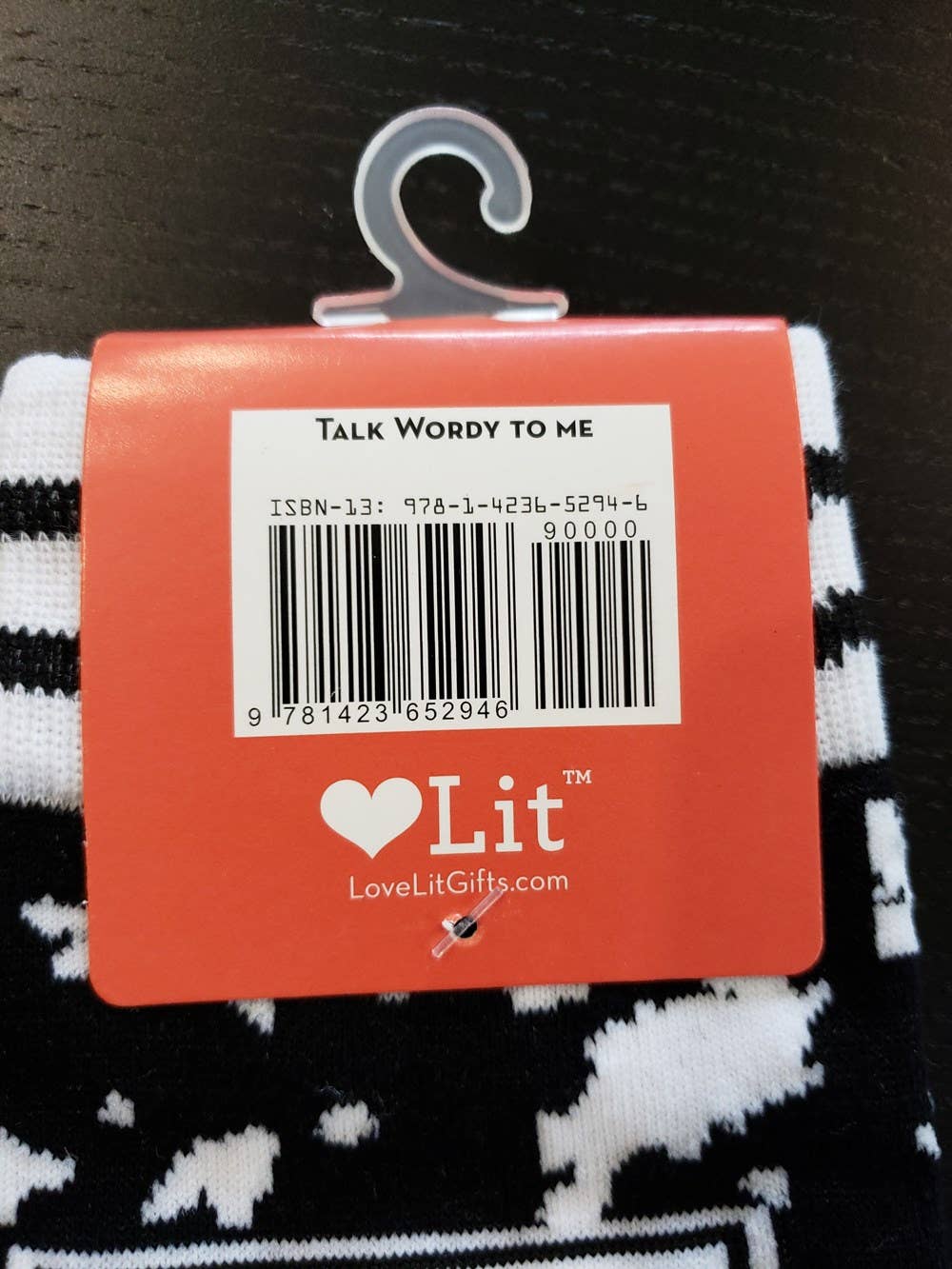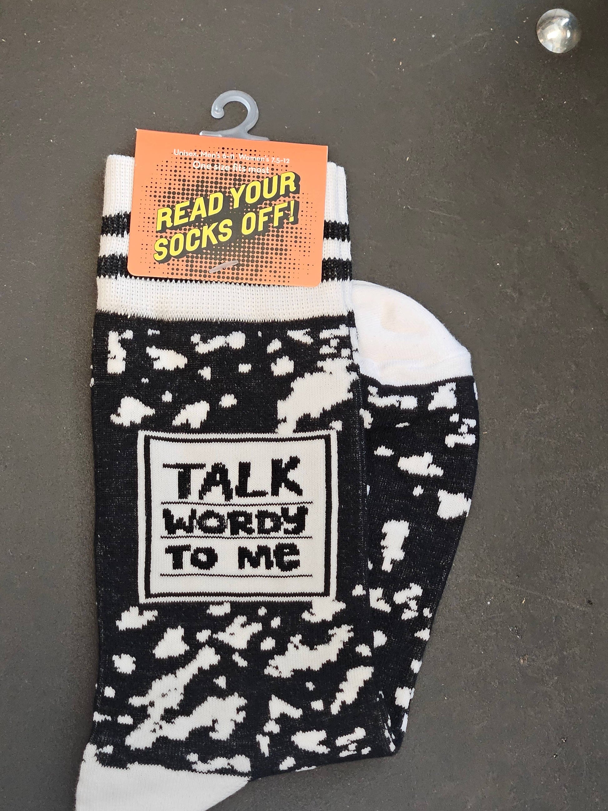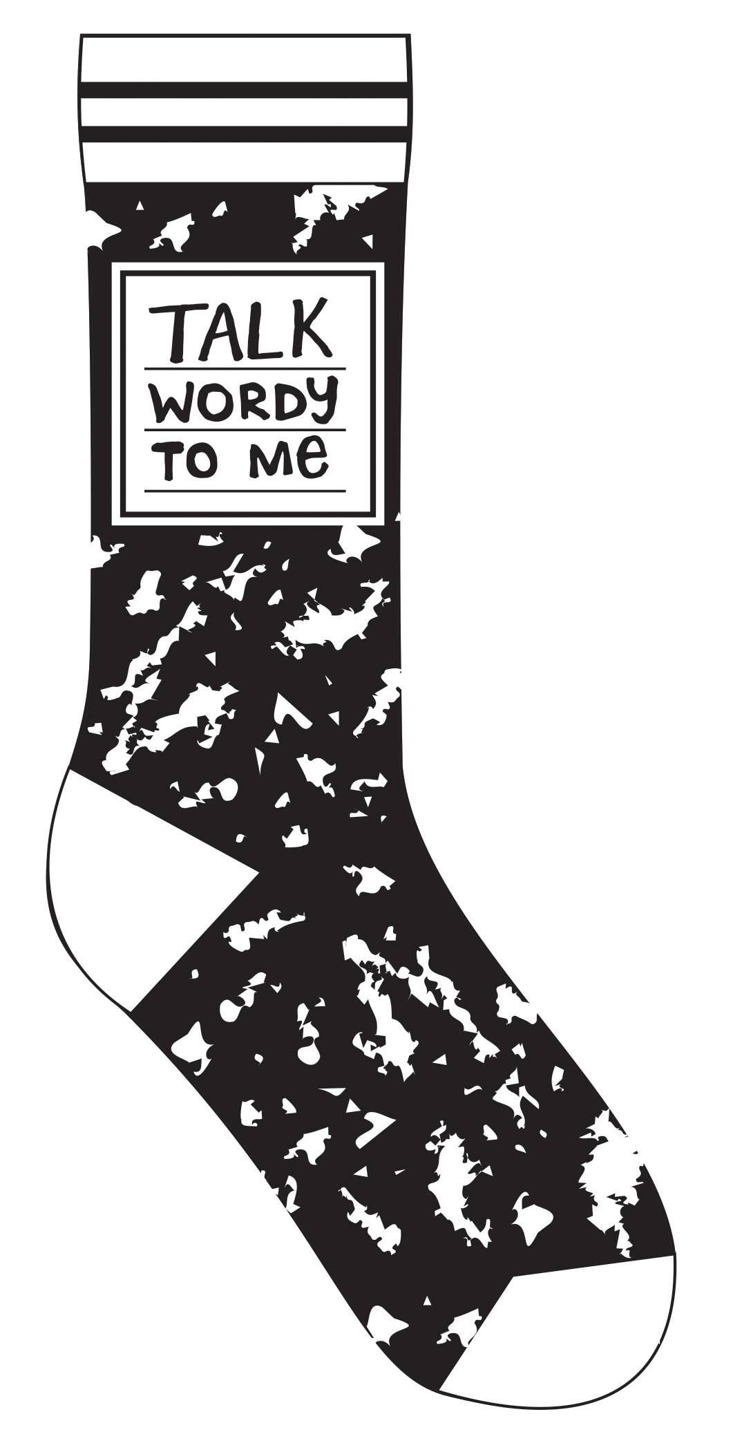 Make reading time extra-cozy in a pair of bookish socks. Talk Wordy to Me socks, inspired by old-school composition books, will set you and your feet up for success. Gibbs Smith socks are made of a 70% cotton, 28% polyester, 2% elastic blend. One-size-fits-most: Women 7.5–12; Men 6–11.