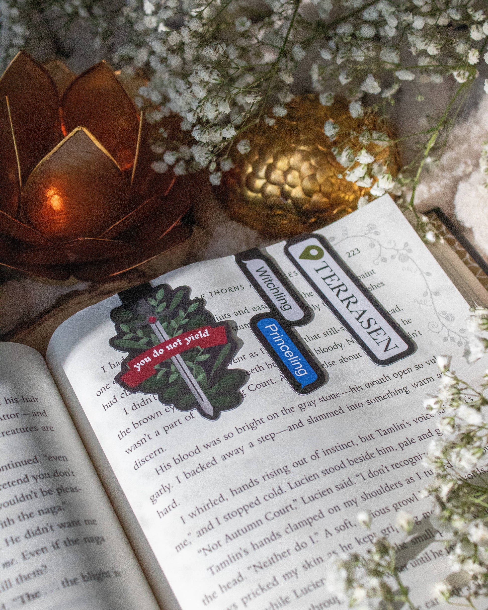 These magnetic bookmarks feature a glossy laminated surface and thin magnetics that encompass the entirety of the design on both front and back with only a small non-magnetic space at the top to fold over. They're double-sided and sturdy so they add a touch of whimsy to your reading experience while also being functional. A must-have for book lovers and Throne of Glass fans.