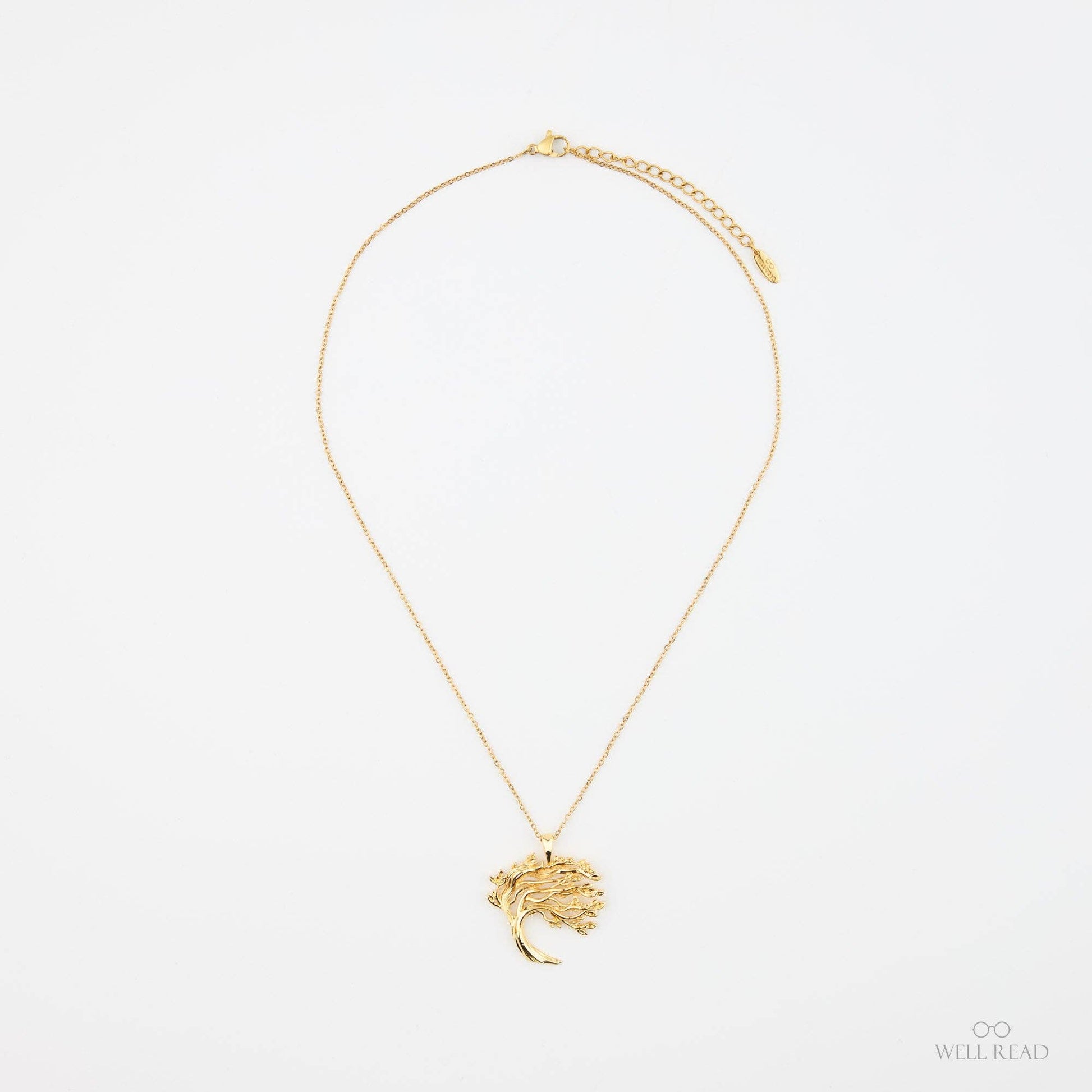 The pendant showcases intricate details, from the flowing branches that bend gracefully to the sturdy trunk, all while maintaining a luxurious golden sheen. Suspended from a delicate yet sturdy chain, this piece strikes a perfect balance between literary allure and modern elegance, making it the ideal companion to our "Wuthering Heights" book crossbody bag.